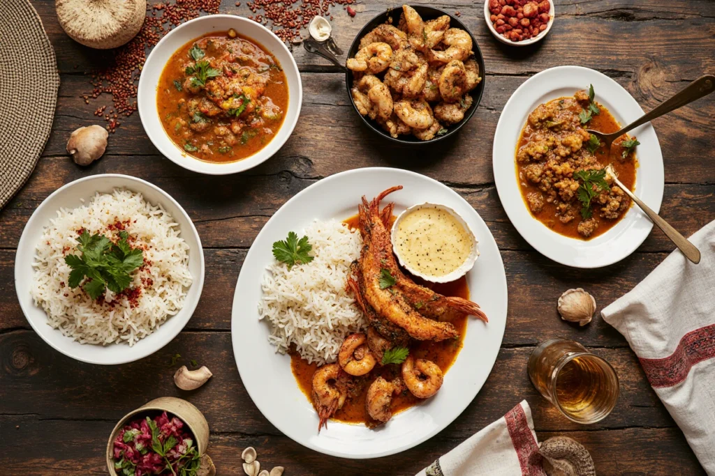 • خوراک میگو بندرعباس: میگوی تازه با ادویه‌های محلی مثل زعفران و سیر که طعمی خوش‌مزه و تند دارد و معمولاً با برنج سرو می‌شود.