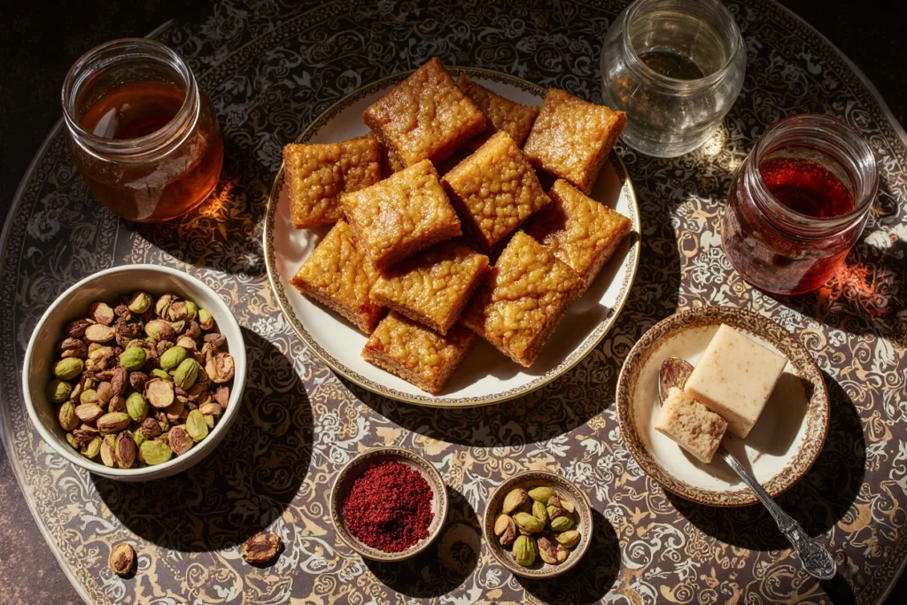• باقلوا تبریز: باقلوا تبریز از ترکیب خمیر فیلو، گردو، پسته، شکر و گلاب تهیه می‌شود. این شیرینی با لایه‌های نازک و طعم شیرین و معطر، یکی از محبوب‌ترین سوغاتی‌های ایران است.