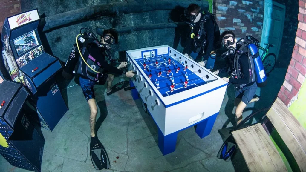 دیپ دایو دبی با عمق 60 متر، یک شهر غرقشده زیر آب را شبیهسازی کرده است. این فضای خلاقانه شامل اتاقهای طراحیشده، کتابخانه، میز بیلیارد، و حتی ماشین زیر آب است. -